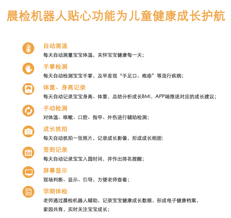 晨檢機器人能自動識別兒童身份,并作出問候。4秒內做出“簽到、自動測溫、手檢、身高、體重”等檢測功能,并拍照留存,實時顯示;以及“體溫、手檢、咳嗽、口腔、外傷、指甲”輔助功能;